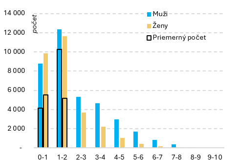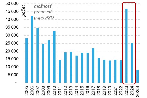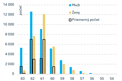 Druhým významným faktorom bolo zavedenie možnosti odchodu do predčasného dôchodku po 40 odpracovaných rokoch, ktoré umožnilo využiť priaznivé podmienky vyššiemu počtu ľudí. Zároveň sa s touto novou možnosťou zaviedlo aj znížené krátenie pre tento druh predčasného dôchodku, ktoré platilo do mája 2024 a ďalej zvýhodnilo predčasný dôchodok. Tejto legislatívnej zmene možno pripísať časť z efektu zvýšeného počtu predčasných dôchodkov, keďže umožnila požiadať o dôchodok aj skôr ako 2 roky pred dovŕšením dôchodkového veku. Identifikovali sme približne 41-tisíc predčasných dôchodkov, ktoré boli priznané nad rámec štandardného počtu z predošlých rokov. Z týchto dôchodkov približne 24-tisíc ľuďom chýbalo do dôchodkového veku viac ako 2 roky (Graf 9), čo znamená, že bez zavedenia novej možnosti odchodu by bol nárast menej ako polovičný.