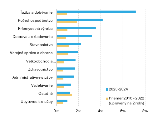 Vlna predčasných dôchodkov zintenzívnila vplyv starnutia populácie na trh práce. Nakoľko je žiadosť o predčasný dôchodok podmienená neexistenciou dôchodkového poistenia (zamestnania), vplyv predčasných dôchodkov na trh práce bol zreteľný už počas roku 2023. Ten len ďalej zvýraznil dlhodobý nepriaznivý demografický trend, keď v dôsledku starnutia populácie odchádza každoročne čoraz väčší počet ľudí do dôchodku. Najvyšší počet predčasných dôchodcov, takmer 15-tisíc, zaznamenalo odvetvie priemyselnej výroby, čo je do veľkej miery spôsobené aj vysokým počtom ľudí pracujúcich práve v tomto odvetví (Graf 13). V prípade, ak zohľadníme aj veľkosť odvetvia, najvýraznejší percentuálny úbytok zaznamenali odvetvia baníctva, poľnohospodárstva a priemyselnej výroby (Graf 14). Zároveň však platí, že do týchto odvetví nastupovali pracovníci v mladšom veku, čo vedie k vyššiemu priemernému počtu odpracovaných rokov v preddôchodkovom veku, a teda vyššiemu podielu ľudí spĺňajúcich podmienku pre predčasný dôchodok.