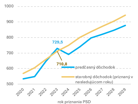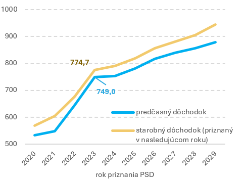 Graf 16: Vývoj SD a PSD, bez prvej valorizácie (v EUR)