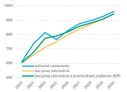 Alternatívnym komplexnejším riešením by preto bolo spojiť zrušenie prvej valorizácie s klauzulou, podľa ktorej by v situácii, kedy valorizácia dôchodkov prekročí rast ADH, bola ADH dočasne zvýšená rovnakým percentom. V ďalšom období by však rástla len tempom dôchodcovskej inflácie, kým by sa nevrátila na pôvodnú trajektóriu určenú 95 %-ným rastom priemernej mzdy (Príloha 1 Graf 27, béžová čiara). Išlo by teda o dočasné opatrenie, ktoré by dlhodobo nezvyšovalo nové dôchodky. Takáto úprava by zabránila tomu, aby novopriznané dôchodky mohli v reálnych cenách medziročne poklesnúť, ako tomu bolo v roku 2025, a zároveň by sa odstránila možnosť arbitráže a špekulatívnych odchodov do predčasného dôchodku. Podrobnejšie sú obidve tieto alternatívy predstavené v rámci Prílohy 1. Ďalšou možnosťou, ktorá by celkom odstránila arbitráž, by bolo stanovenie stropu valorizácie dôchodkov na úrovni rastu ADH.