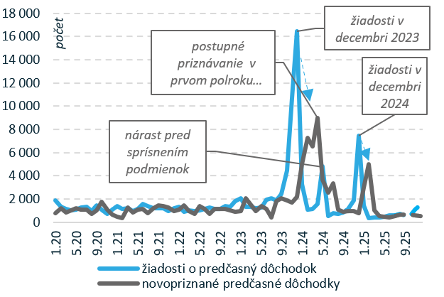 Graf 1: Počet žiadostí a novopriznaných predčasných dôchodkov – mesačne