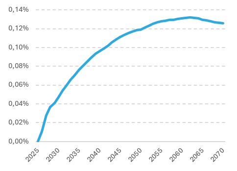 Zrušenie prvej valorizácie by prinieslo dlhodobú úsporu na úrovni takmer 0,14 % HDP. V prípade zrušenia prvej valorizácia by sa fiškálny vplyv prejavoval postupne, keďže opatrenie by sa týkalo len novopriznaných dôchodkov. Spolu s rastúcim podielom dôchodkov priznaných na nižšej úrovni by však v čase dlhodobo rástol a plne sa prejavil ďaleko za rozpočtovým horizontom. Zároveň, dlhodobé projekcie nepredpokladajú opakovanie podobných inflačných šokov ako v rokoch 2023 a 2024, ktoré by opätovne umožnili arbitráž. V prípade ich opakovania by však fiškálna úspora mohla dosiahnuť rádovo stovky miliónov eur, ako ukazuje kvantifikácia v Grafe 3.