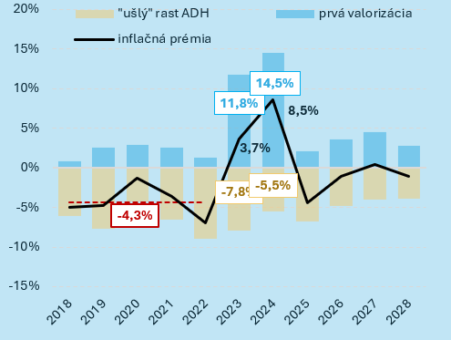 Inflačnú prémiu vidieť v rokoch 2023 a 2024. V roku 2023 prvá valorizácia ($dCPI_{t-1}$) na úrovni 11,8 % predbehla 7,8 %-ný rast ADH ($\Delta NM_t^{3Q}\cdot 0.95$). Ešte výraznejšie zvýhodnenie z inflačnej prémie vzniklo v roku 2024 (Graf 21). Tí, ktorí si stihli požiadať o predčasný dôchodok v roku 2024 mali o 8,5 % vyšší dôchodok, než keby s priznaním čakali do roku 2025 (bez zohľadnenia krátenia predčasných dôchodkov a dodatočného odpracovnané obdobia). Pri súčasných predpokladoch v nasledujúcom období vznik výraznejšej inflačnej prémie neočakávame. Zároveň však platí, že legislatívne spomalenie rastu ADH na 95 % priemernej mzdy od roku 2023 a relatívne pomalší rast reálnej mzdy v nasledujúcich troch rokoch znižujú penalizáciu predčasných dôchodkov v porovnaní s predošlým obdobím (2018 – 2022) a riziko vzniku inflačnej prémie v budúcnosti je preto vyššie ako bývalo v minulosti (Graf 21, červená čiarkovaná čiara).
