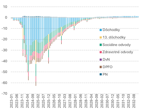 Graf 3: Vplyv predčasných odchodov z trhu práce na saldo verejnej správy (mesačne, v mil. eur)