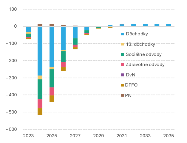 Graf 4: Vplyv predčasných odchodov z trhu práce na saldo verejnej správy (ročne, v mil. eur)