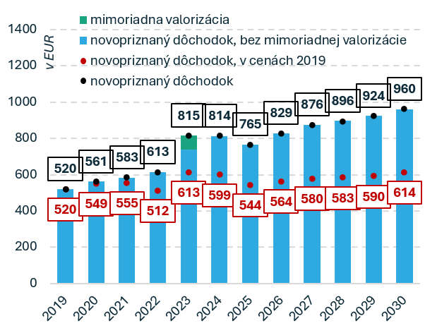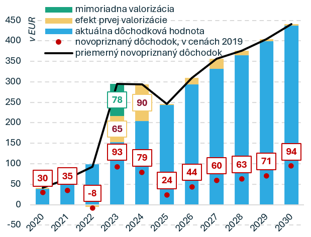 Prvá valorizácia sa výrazne prejavila v rokoch 2023 a 2024 a rapídne zvýšila úroveň novopriznaných dôchodkov. Vplyv parametrov na výšku novopriznaného dôchodku ilustruje porovnanie modelového novopriznaného starobného dôchodku v čase (Graf 5, čierne body). Človeku ktorý odpracoval 40 rokov a jeho mzda sa pohybovala na úrovni priemernej mzdy by bol v roku 2022 priznaný dôchodok 613 eur. Ak by dovŕšil dôchodkový vek o rok neskôr bol by mu pri totožných parametroch priznaný dôchodok o viac ako 200 eur vyšší (815 eur) a približne rovnaký dôchodok by mu bol priznaný ak by dovŕšil dôchodkový vek v roku 2024. Dôvodom boli najmä vysoké hodnoty prvej valorizácie (Graf 6, žltý a zelený stĺpec), ktorá v roku 2023 zvýšila dôchodky o 142 eur[8] a v roku 2024 o 90 eur. Naopak, v roku 2025 by modelovému dôchodcovi bol priznaný dôchodok 765 eur, teda približne o 50 eur nižší ako v roku 2024 a to aj napriek tomu, že cenová hladina (a nominálne mzdy) v tomto období rástla. Podobný obraz dostaneme aj keď zohľadníme rast cien a dôchodky očistíme o infláciu (Graf 5, červené body).