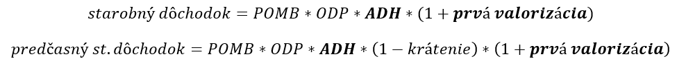 Výška novopriznaného dôchodku závisí, zjednodušene[3], od počtu odpracovaných rokov (ODP[4]), relatívnej úrovne celoživotnej mzdy (POMB[5]) a výšky priemernej mzdy v hospodárstve (ADH[6]). Takto vypočítaná suma sa následne zvýši o percento, ktorým boli štandardne valorizované dôchodky 1. januára daného roku (prvá valorizácia) a o prípadnú mimoriadnu valorizáciu a v prípade predčasného dôchodku sa uplatní krátenie[7]: