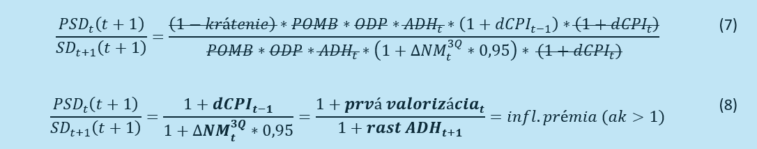 Pri rozhodovaní o skoršom odchode do dôchodku je dôležité porovnať výšku predčasného dôchodku (PSD) a dôchodku priznaného pri dovŕšení dôchodkového veku (SD) v rovnakom čase (napr. pri priznaní SD). Dôvodom je, aby porovnanie vyjadrilo trvalý rozdiel medzi dôchodkami, teda aby sa zohľadnili aj valorizácie predčasného dôchodku do momentu priznania starobného dôchodku. S istou mierou zjednodušenia[19] stačí potencionálnemu žiadateľovi zvažujúcemu odchod do dôchodku rok pred dovŕšením dôchodkového veku porovnať len dva parametre. V prípade, ak je prvá valorizácia ($dCPI_{t-1}$) vyššia ako očakávaná hodnota rastu miezd v treťom kvartáli ($d NM_{t}^{3Q}$) bude predčasný odchod do dôchodku finančne výhodnejší.