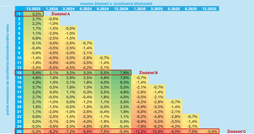 Žiadateľ B: Trinásť mesiacov do dôchodku (dôchodkový vek dovŕši v januári 2025)