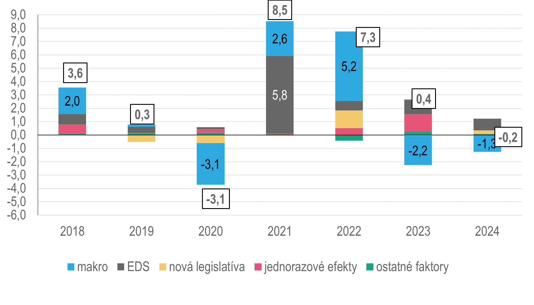 Medziročné príjmy z daní a odvodov vzrástli v roku 2024 o 3,1 mld. eur (8,1 %) (Graf 7). Z veľkej časti je rast ťahaný rastom hlavných makroekonomických ukazovateľov, ako sú HDP, spotreba domácností a nominálne mzdy. Druhým pozitívnym faktorom bola nová legislatíva. Rozšísil sa regulovaný odvod pre banky, zvýšili sa spotrebné dane z tabakových výrobkov, zaviedla sa minimálna daň pre právnické osoby, znížil sa odvod do druhého piliera, predlĺžil sa solidárny príspevok aj na rok 2024 a množstvo ďalších opatrení. Efektívne daňové sadzby mierne medziročne klesli, nakoľko rast daní a odvodov nekopíroval v plnej miere rast makrozákladní. Tento efekt bol prítomný pri väčšine daní. Výnimkou sú sociálne a zdravotné odvody, miestne dane a daň vyberaná zrážkou. Jednorazové a iné faktory sa medziročne zmenili len minimálne.