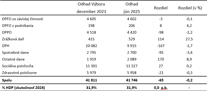 Tabuľka 1: Porovnanie prognózy a aktuálneho odhadu výnosu daní a odvodov za rok 2023 (ESA2010, mil. eur)