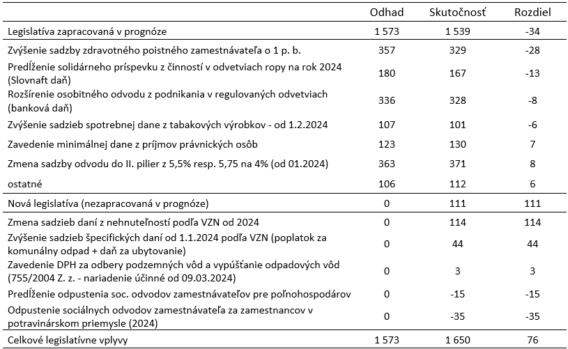 Výnos daní ovplyvnili aj legislatívne vplyvy, ktoré sa do rozpočtu nezahrnuli. Nové opatrenia zvýšili príjmy o 111 mil. eur. Ide najmä o zvýšené sadzby daní z nehnuteľností a daní za špecifické služby (za komunálny odpad a za ubytovanie). Sadzby si obce schvaľovali až koncom roka 2023, a preto nebolo možné tento vplyv zahrnúť do rozpočtu. Okrem toho sa odpustilo platenie sociálnych odvodov zamestnávateľom za zamestnancov v potravinárskom priemysle a prišlo aj k predĺženiu odpustenia odvodov pre poľnohospodárov (detailné informácie sú v Tabuľke 3).