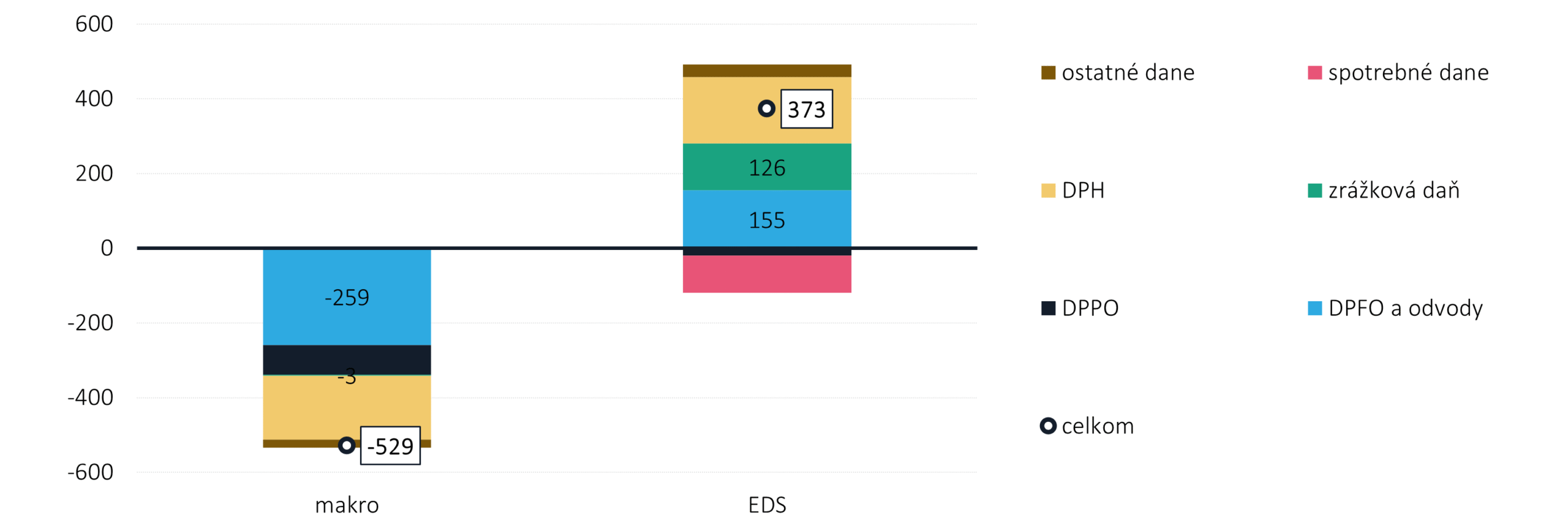 Graf 2: Vplyvy vývoja makra a EDS z pohľadu vybraných daní (v mil. eur)