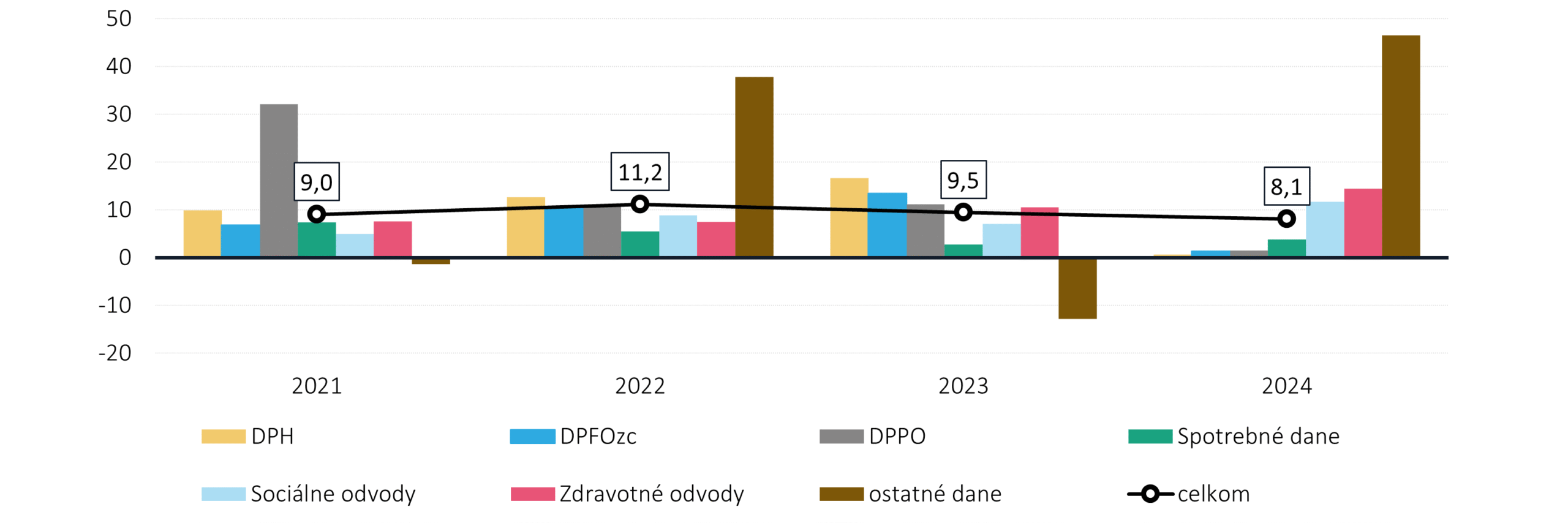 Väčšina daní medziročne vzrástla (graf 8). Z pohľadu jednotlivých daní zaznamenali výraznejší nárast sociálne a zdravotné odvody (11,8% a 14,5%). Významné dane, ako DPFO, DPPO a DPH, ktoré posledné roky rástli viac ako 10%, zaznamenali v roku 2024 len mierne rasty na úrovni 1-2%. K celkovému rastu príjmov významne prispeli ostatné dane, v ktorých je zahrnutý napr. osobitný odvod z podnikania v regulovaných odvetviach (rozšírený o bankovú daň), solidárny príspevok, miestne dane aj daň vyberaná zrážkou.