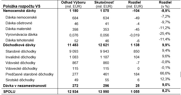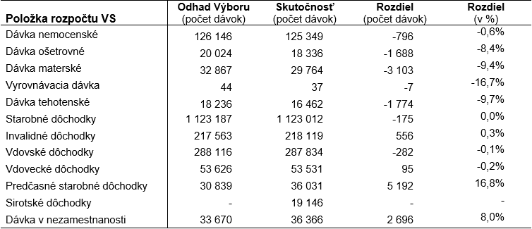 Prognóza výdavkov na nemocenské dávky bola v porovnaní so skutočnosťou nižšia o 104 mil. EUR (približne 8,9 %). Nominálne najväčšie rozdiely boli v dávkach nemocenské (49 mil. EUR) a materské (45 mil. EUR). Za predpokladmi rozpočtu opätovne najviac zaostali počty dávok materského a tehotenského. Nadhodnotenie prognózy oproti skutočnosti bolo v oboch prípadoch približne 10%. V minulosti sa už pristúpilo k zmene predpokladov a naviazaniu počtu dávok na počet pôrodov, čím sa docielilo výrazné spomalenie ich rastu. Počet pôrodov však klesol významne rýchlejšie v porovnaní s prognózou a preto bol očakávaný počet dávok stále výrazne konzervatívny. Celkové čerpanie otcovského bolo v súlade s prognózou, odchýlka nastala len v štruktúre. Kým počet dávok tiež zaostal za skutočnosťou, vyvážila ho vyššia ako očakávaná priemerná dávka.