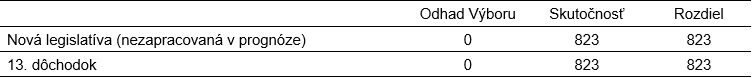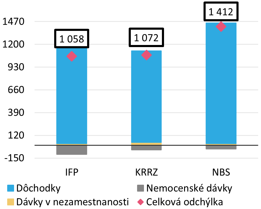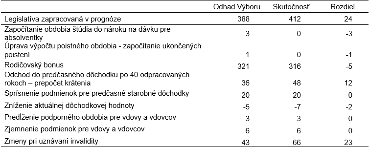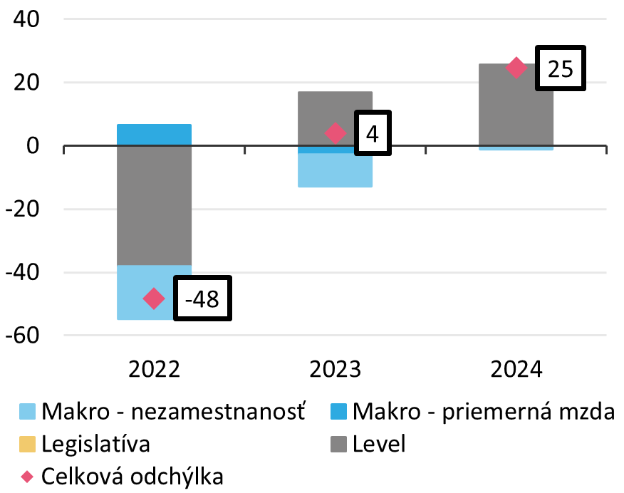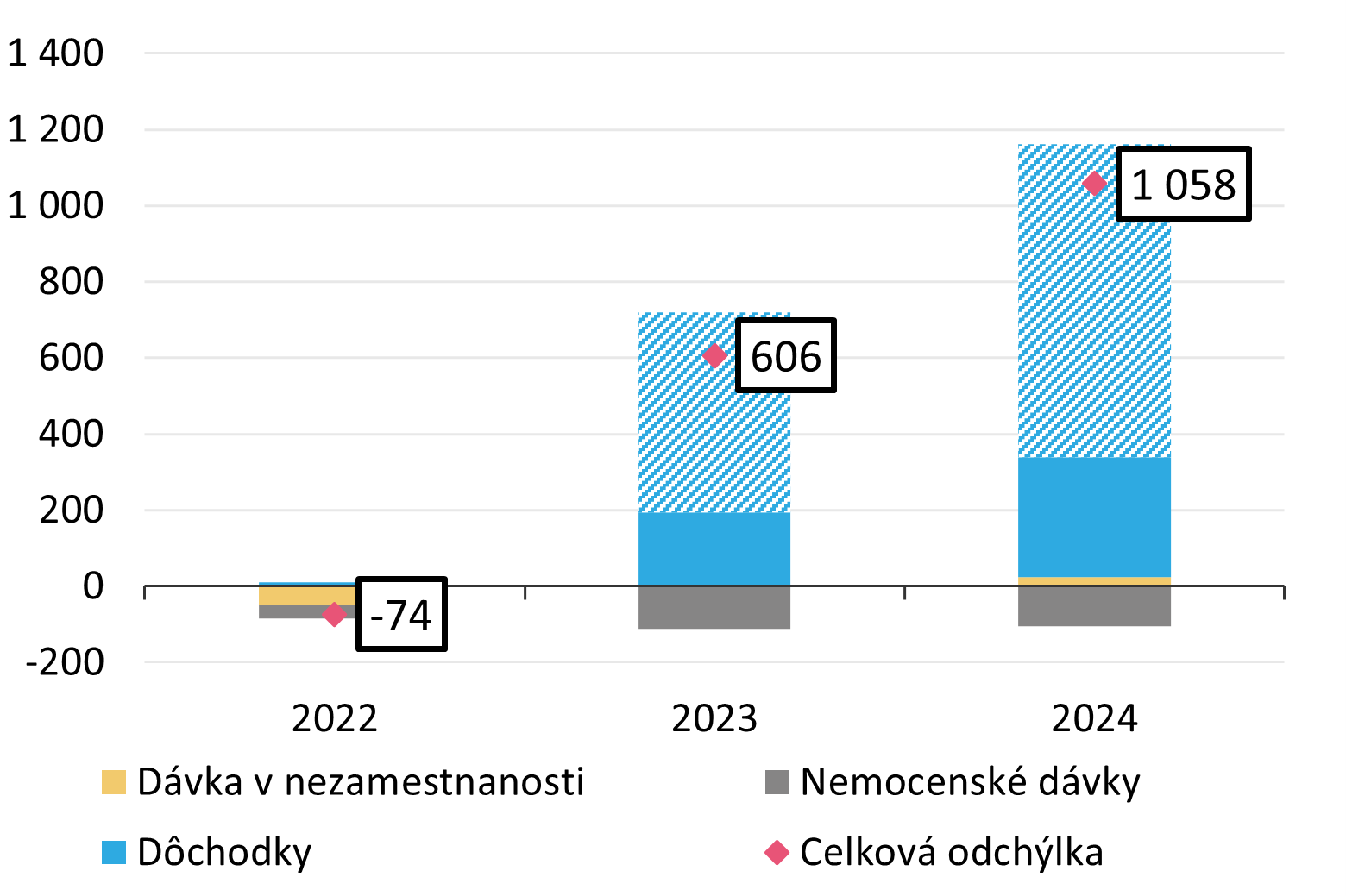 * Šrafované časti zobrazujú legislatívu, ktorá nemohla byť zapracovaná v čase tvorby prognózy (nebola vtedy ešte známa alebo bola iba v začiatkoch legislatívneho procesu). Konkrétne ide o mimoriadnu valorizáciu v roku 2023 a 13. dôchodok v roku 2024.